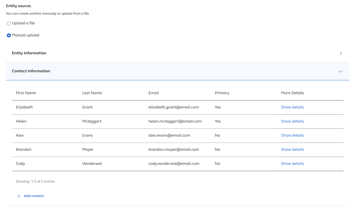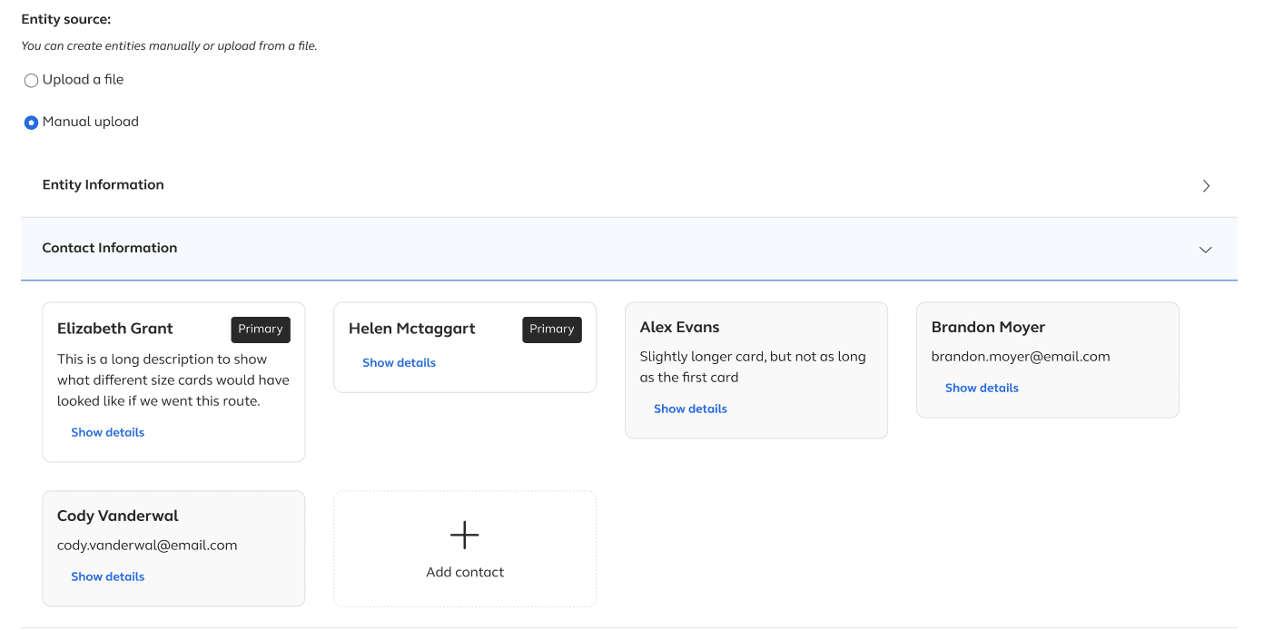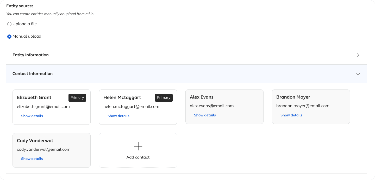 The create flow had three distinct sections of information: entity details, contacts, and banking accounts. Before getting to those sections though, users had a choice to make — how they wanted to create entities in the first place.