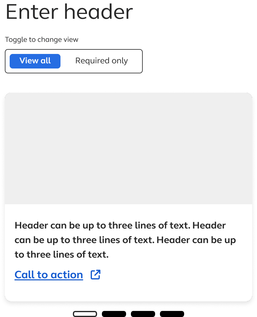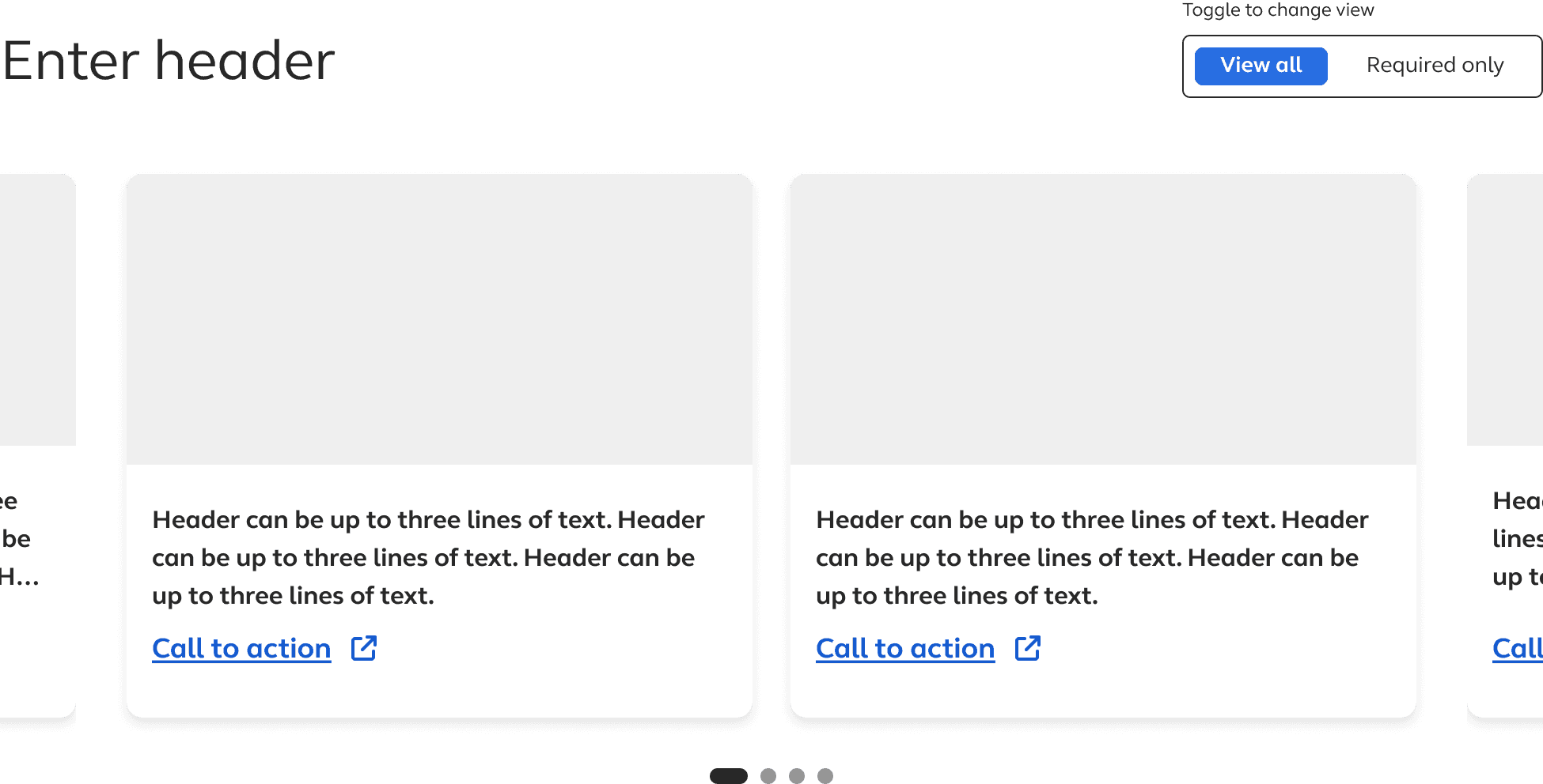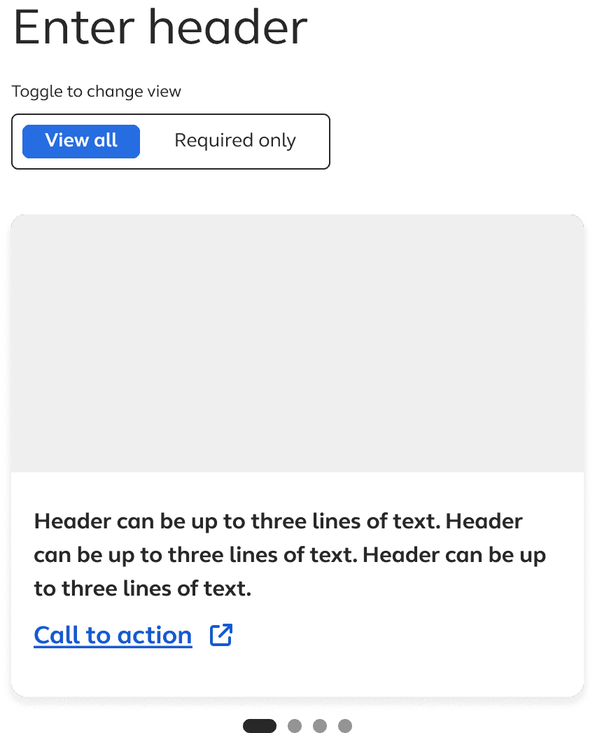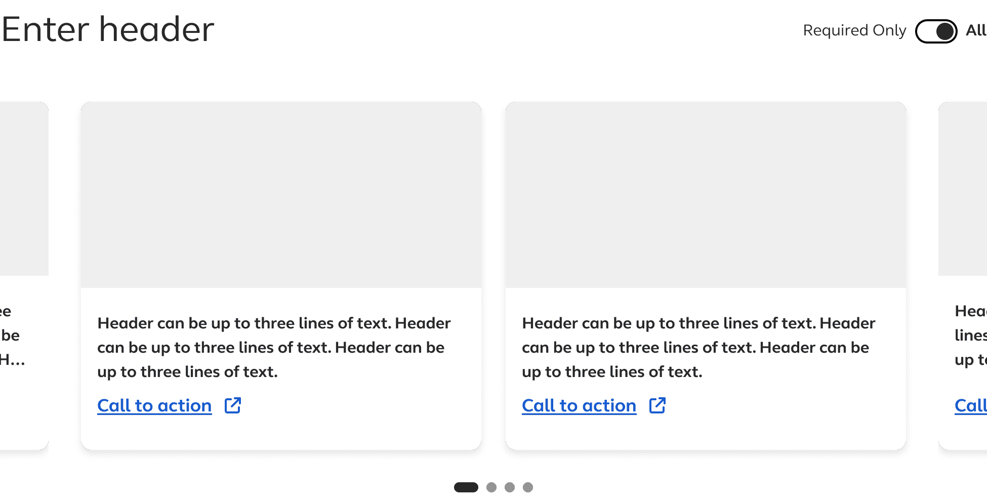 The stakeholders had a preference for an indicator style that I felt was too visually heavy and did not clearly communicate which page the user was on. I proposed a variation that split the difference. I borrowed the shape from an older carousel pattern that had been retired from the platform and combining it with a slightly larger active state indicator. This is the version we ended up moving forward with.