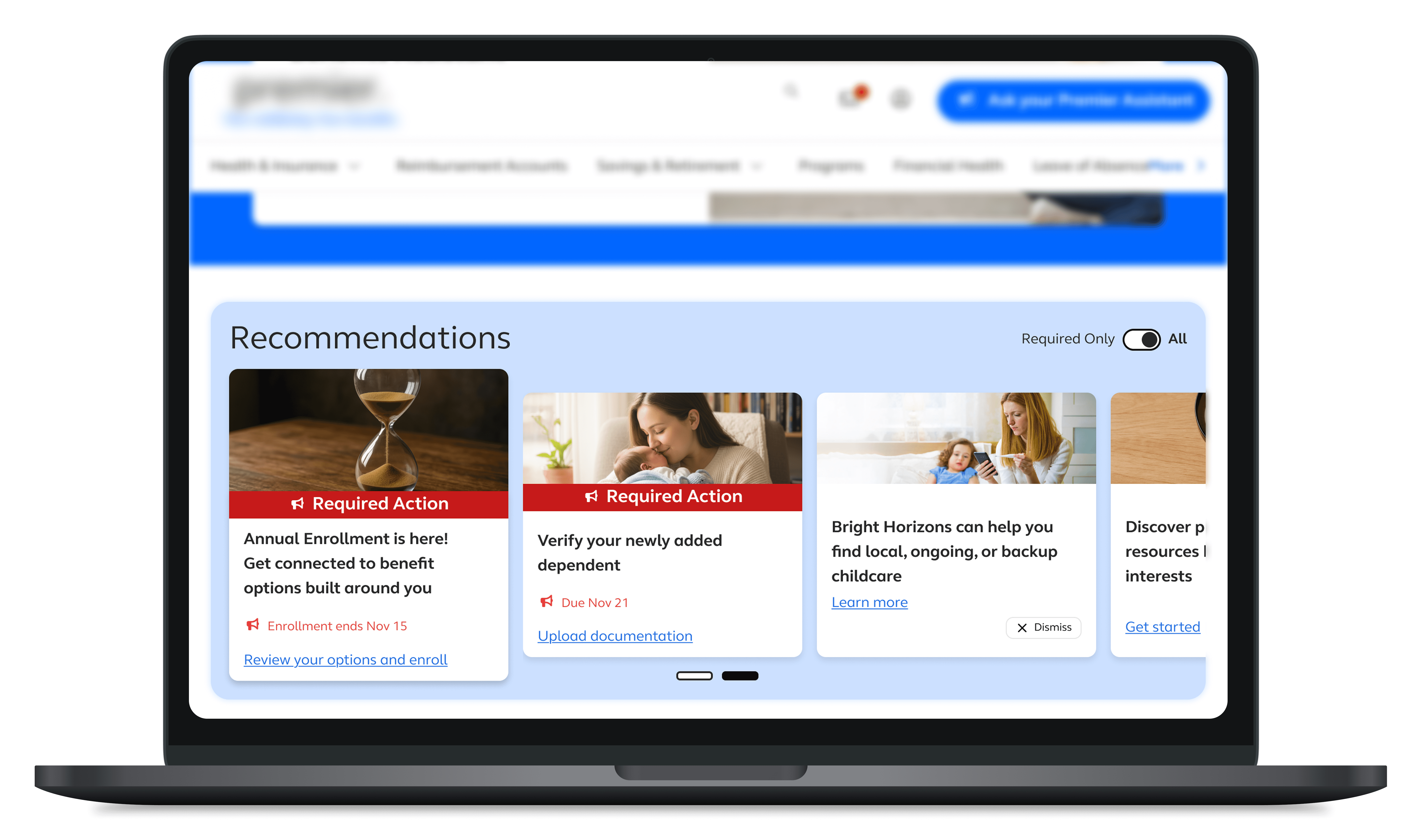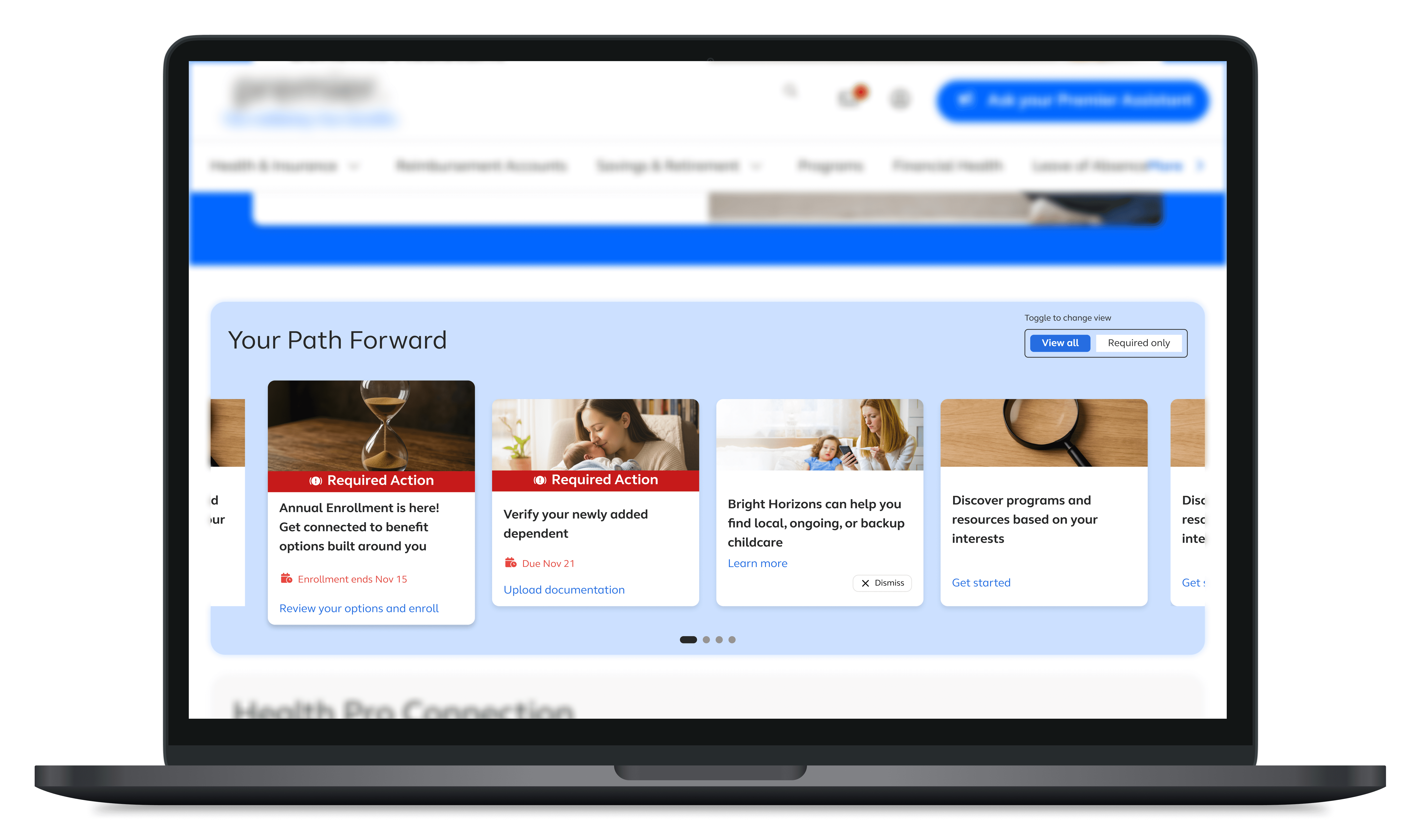 The platform was undergoing a significant redesign with a focus on surfacing AI-driven recommendations and tasks directly on the end user home screen. One of the new sections being added was a horizontally scrolling card feed. This feed was a place where users could see required actions, upcoming deadlines, and programs relevant to them, all in one place.