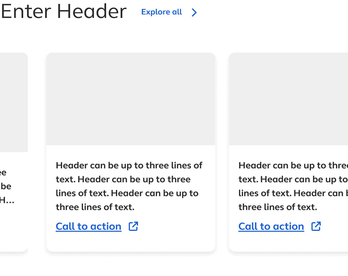 I explored a title component that followed a similar pattern to Netflix. The concept had a section header that revealed an Explore all option on hover, opening either a modal or a dedicated page showing all available cards. My preference was a dedicated page because it gave users a complete picture of everything available rather than hiding content behind the carousel mechanic. The stakeholders decided against it. The push was for users to scroll rather than navigate to a new screen. I disagreed with that reasoning but did not push back, it was not a battle worth fighting because the component would still function properly without it.