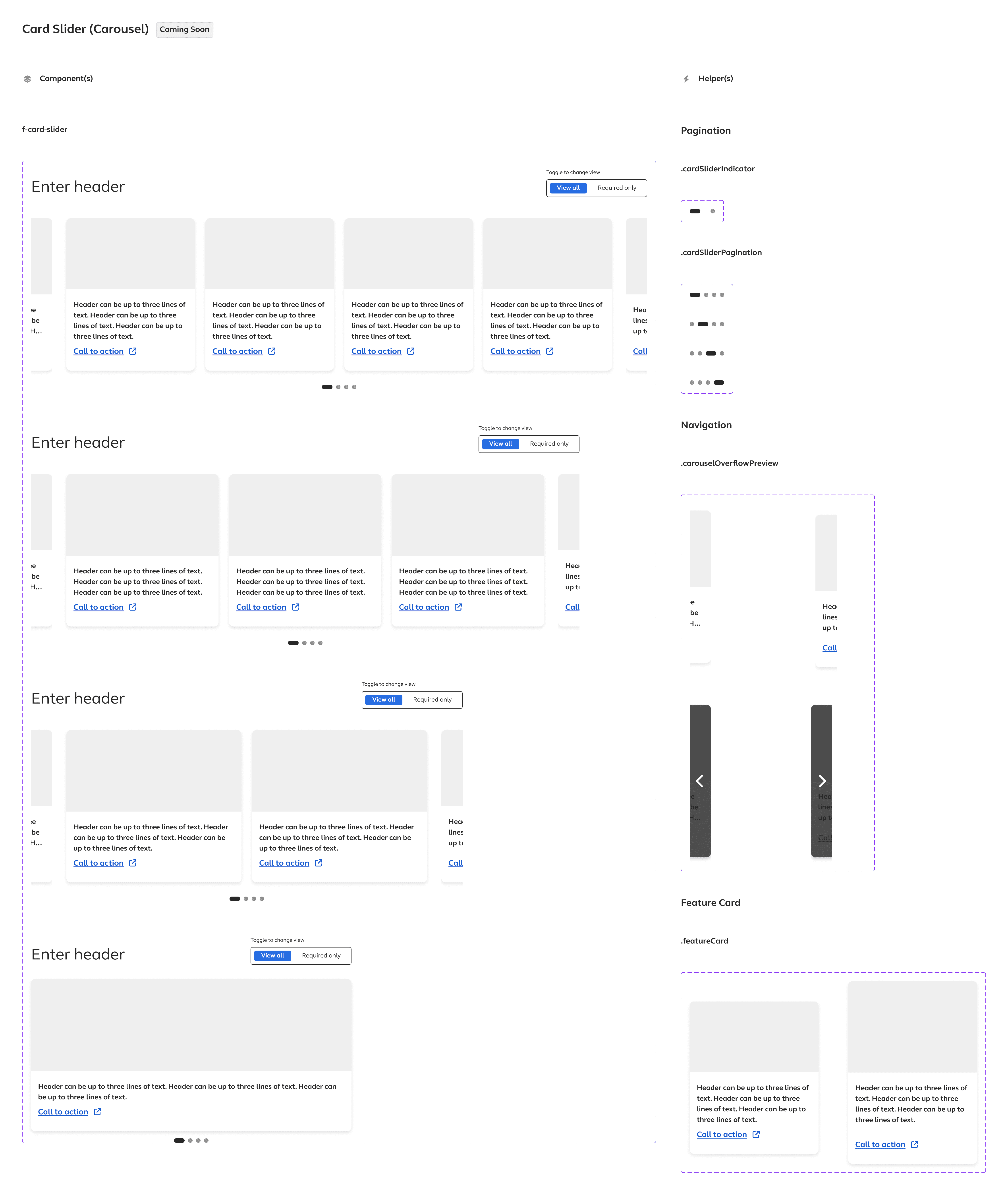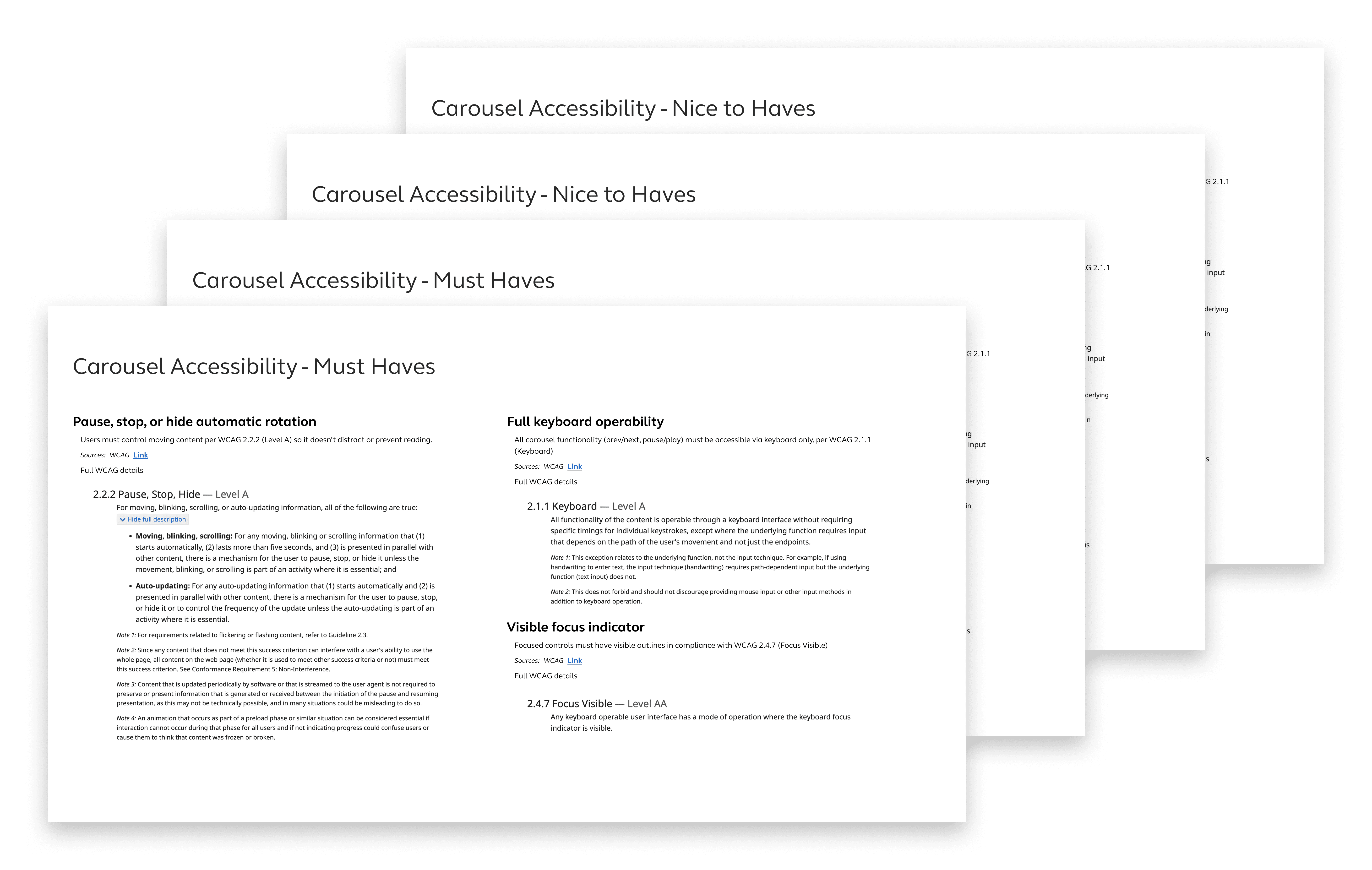 Carousels are one of the most accessibility-complex components in common use. Before finalizing any interaction decisions, I researched WCAG requirements that applied specifically to this component and documented them for the development team. Some of that research directly informed design decisions, specifically around the indicator position, the keyboard navigation behavior, and the focus state specifications.